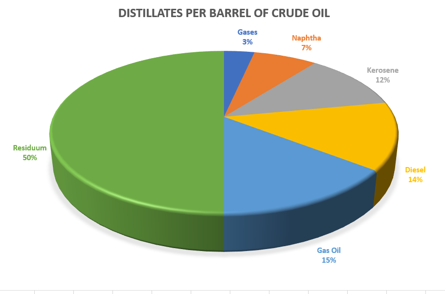 - Residuum: Typically, 50-60% of a barrel of crude oil.